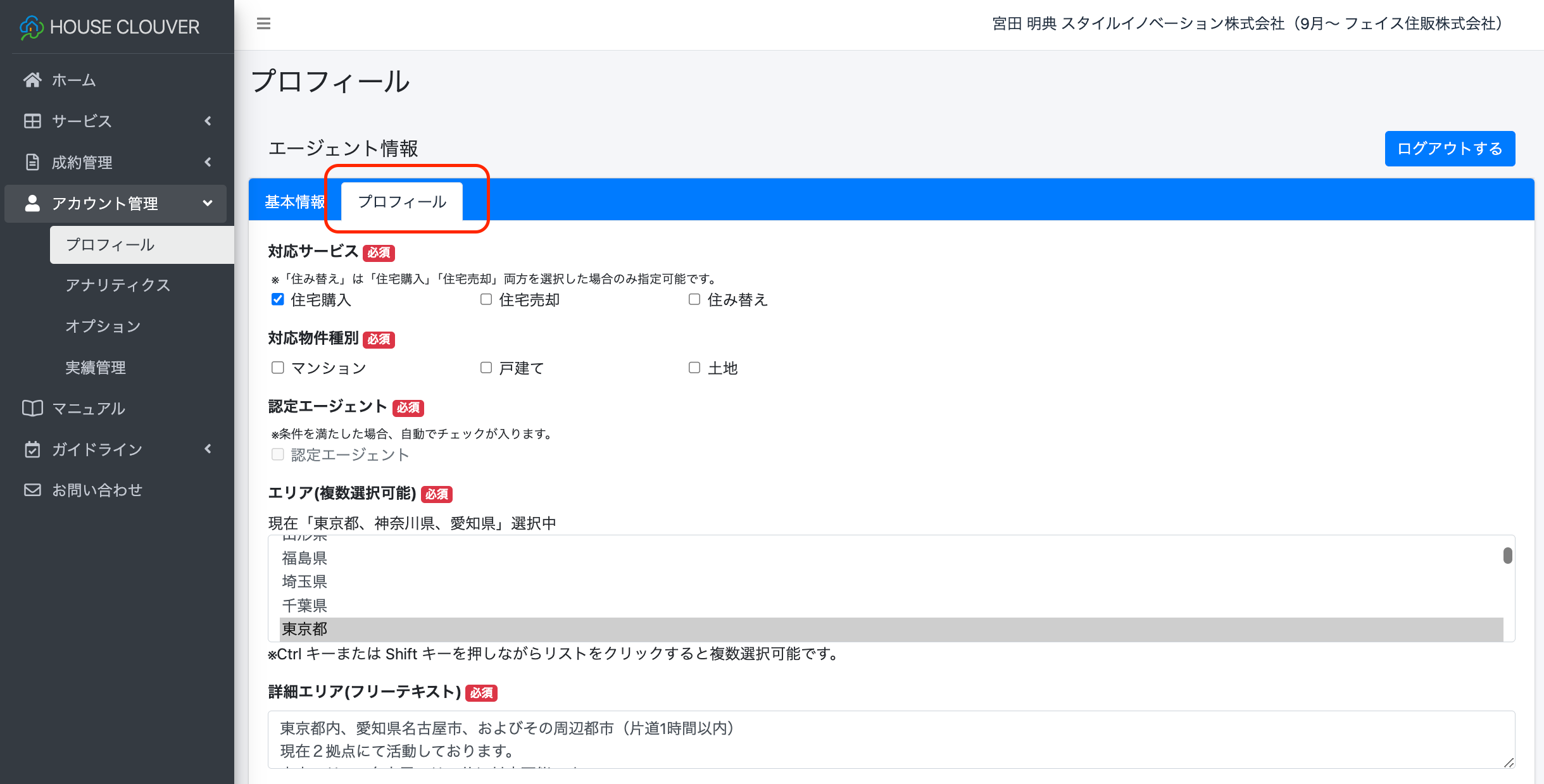 まず、マイページの「アカウント管理」をクリックして「プロフィール」を開きます。