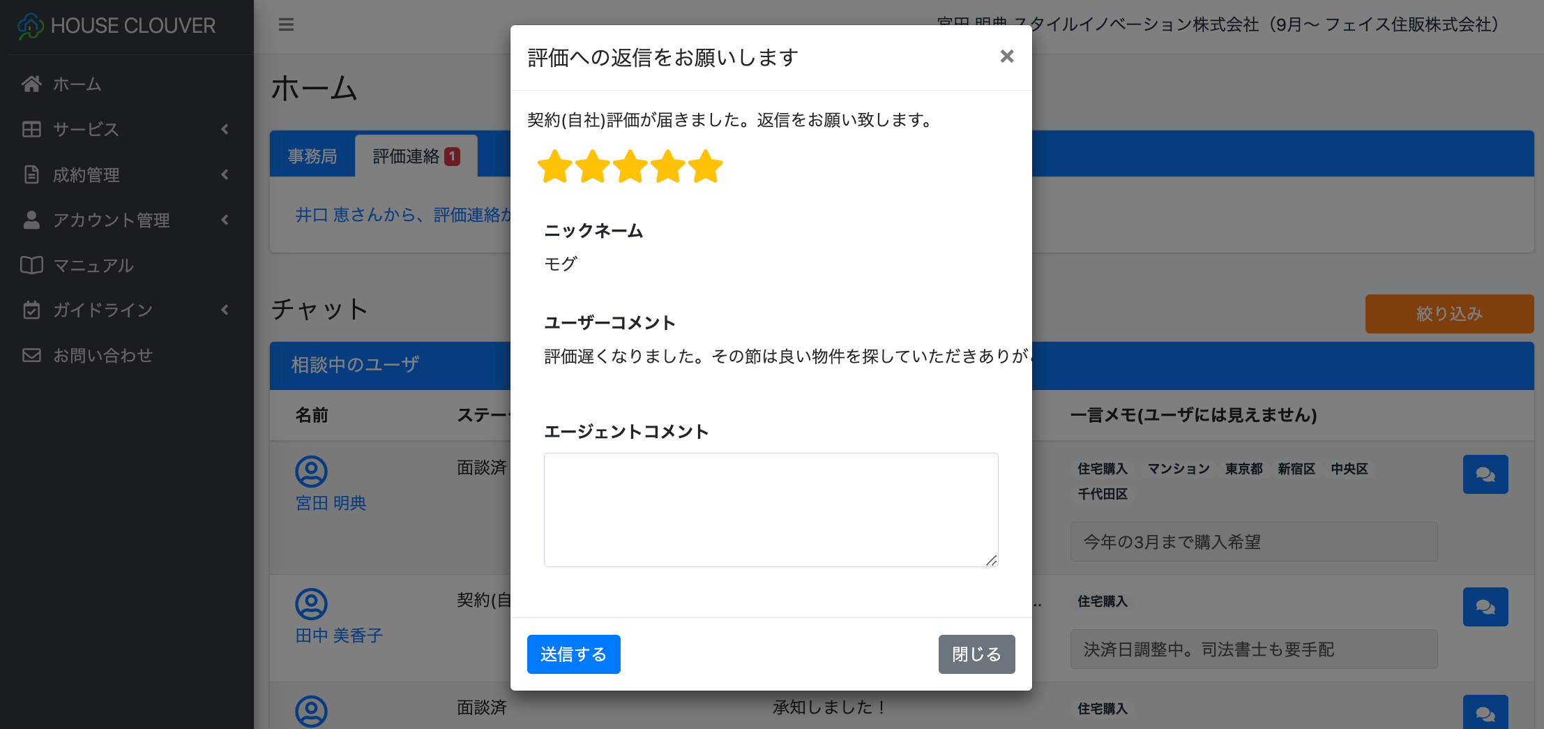 このタブの中から「面談済」「契約(自社)」「引き渡し済」を選択して「更新」をすると、ユーザーに評価依頼がチャットで届きます。
