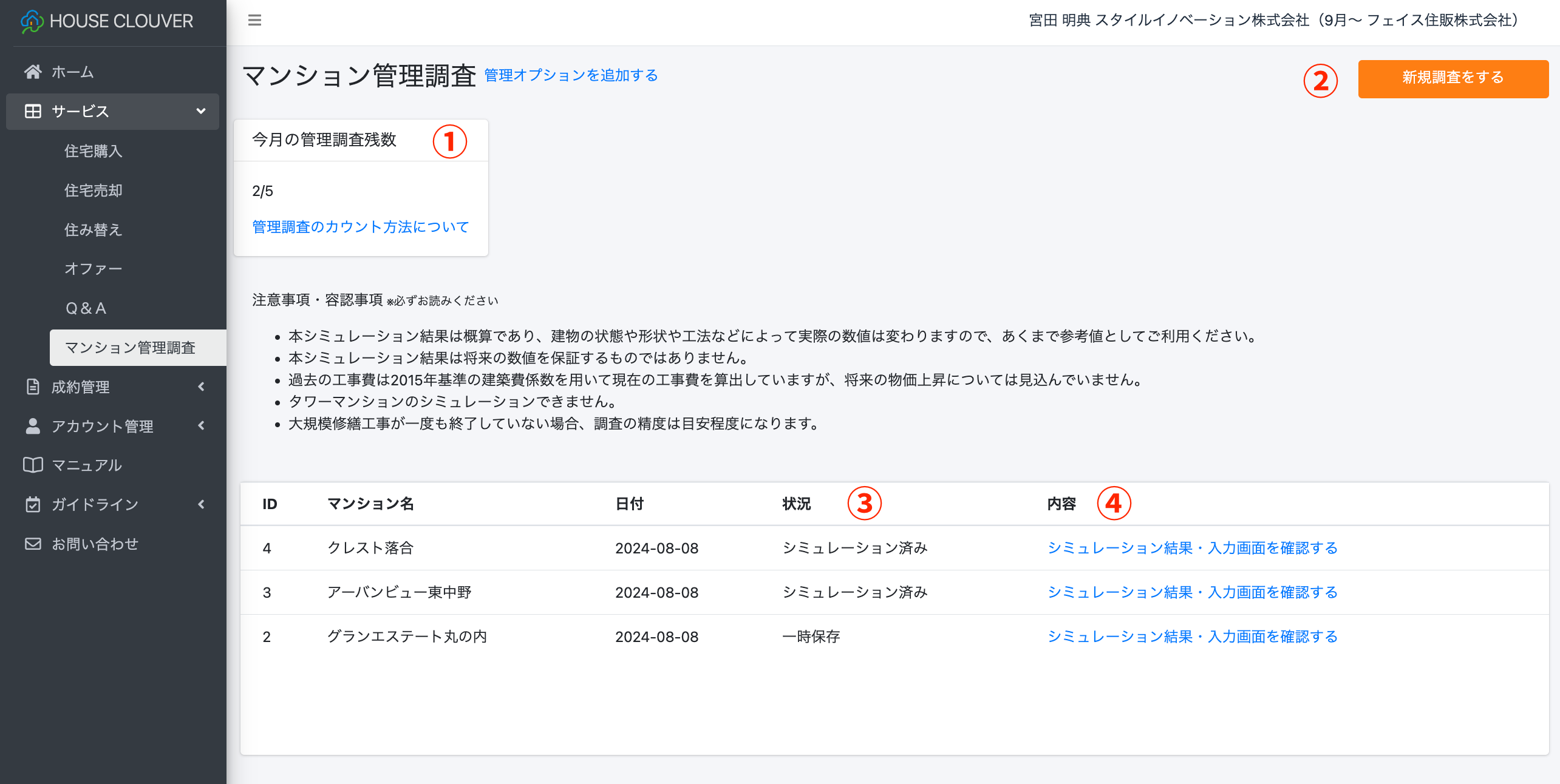 メニューバーの「サービス」>「マンション管理調査」をクリックします。