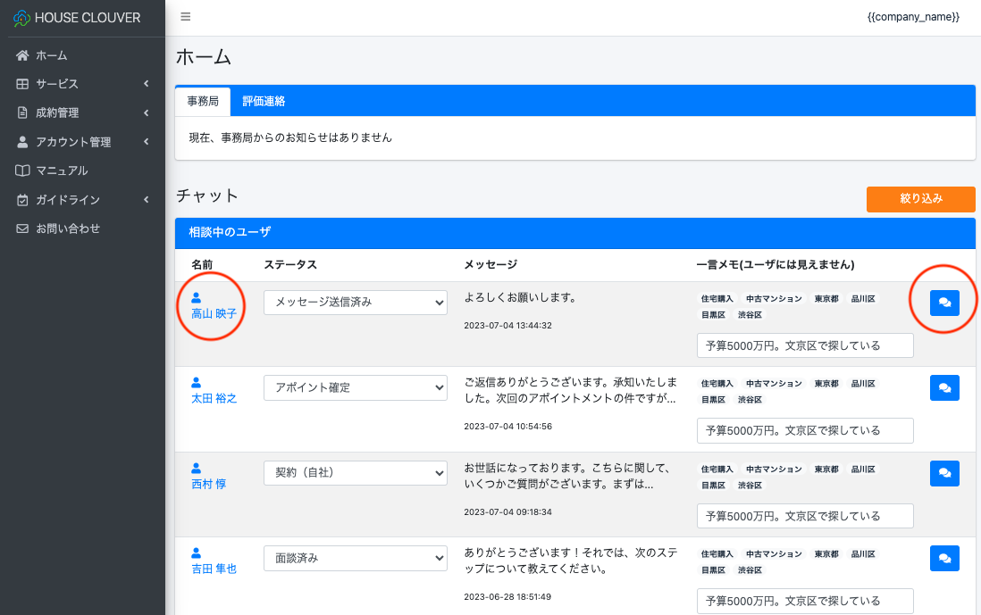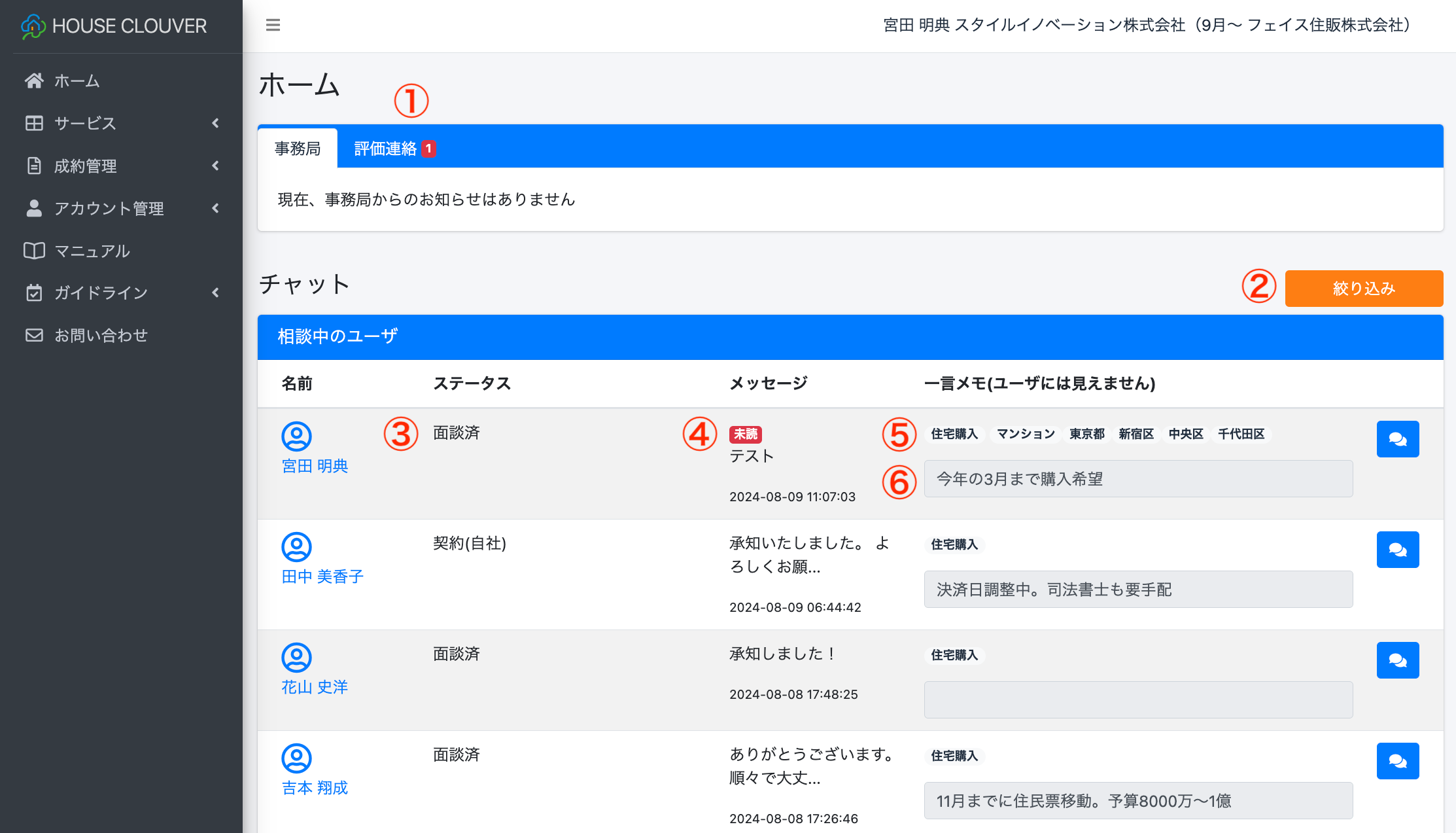複数の対応サービス(住宅購入・住宅売却・住み替え)を選択している場合は、すべての対応サービスのユーザーが表示されます。