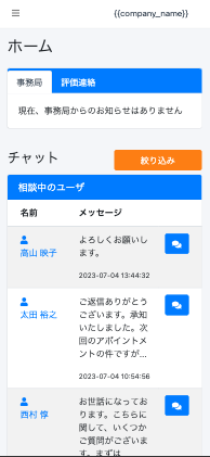 ホーム画面、もしくは各サービストップページより、対象のユーザーの顔マーク・名前・チャットマークをクリックするとチャット画面が開きます。